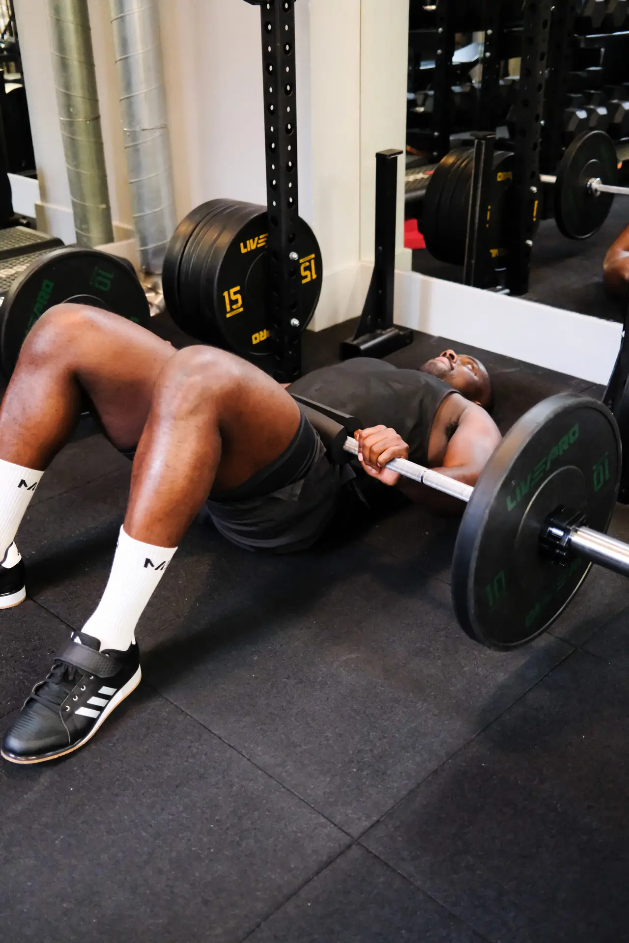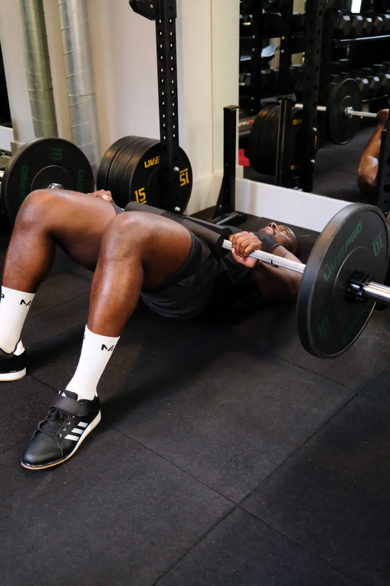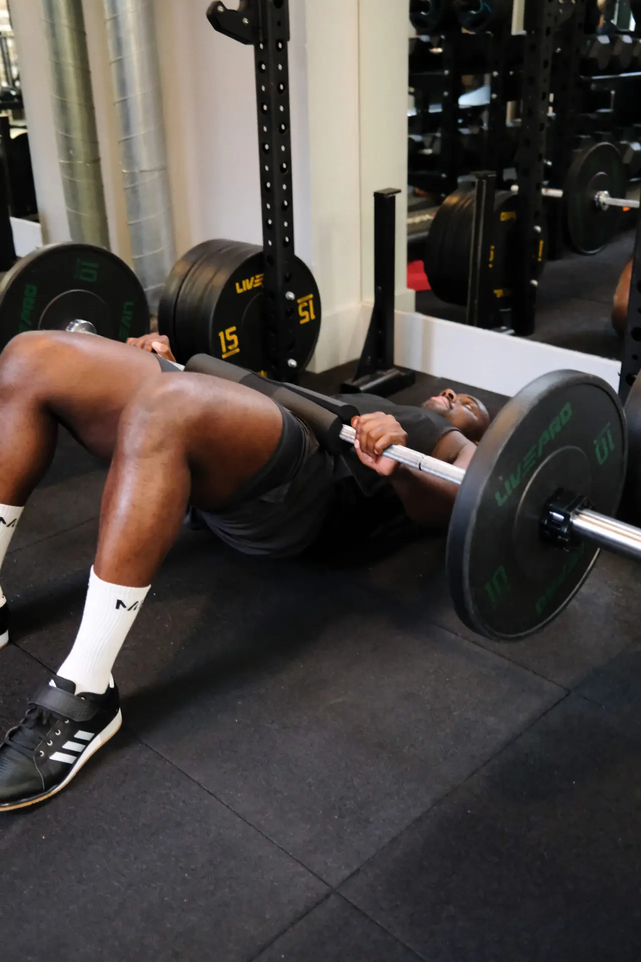 Sit with your upper back against a bench, barbell across your hips. Plant your feet firmly on the ground and drive through your heels to lift your hips up, squeezing your glutes at the top. Lower with control and repeat.